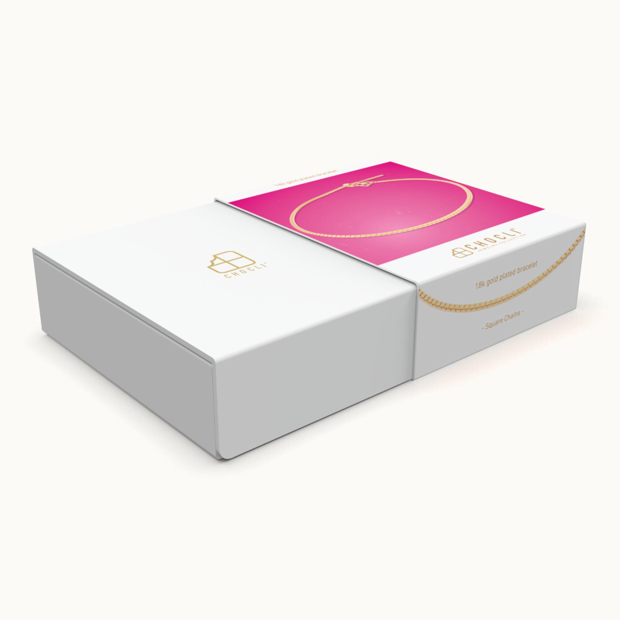 Packaging: White jewelry box with gold foil logo + Colored sleeve