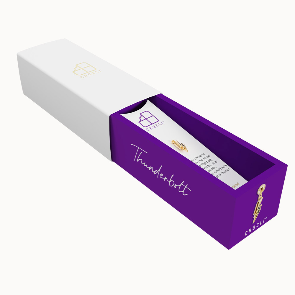 Packaging: Colored jewellery box + white sleeve with gold foil logo
