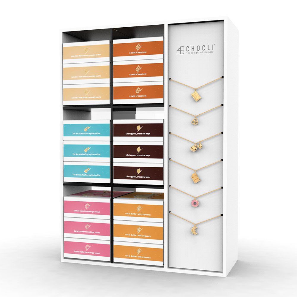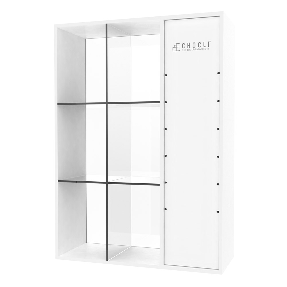 A tall, acrylic display designed for counters or shop tables. It presents 6 Ready-to-Wear necklaces and uses a secure back-locking system so the necklaces can’t be removed without opening the display.