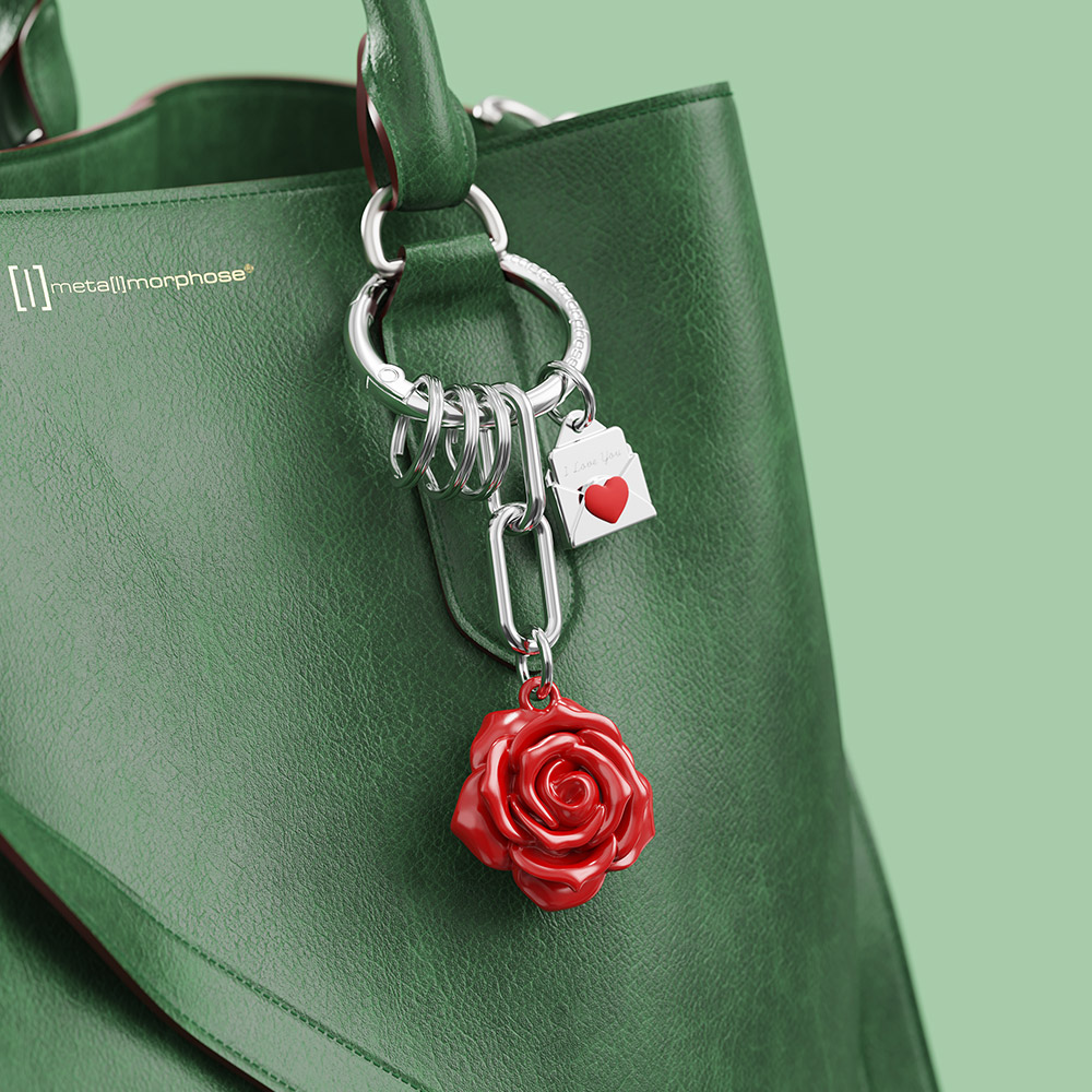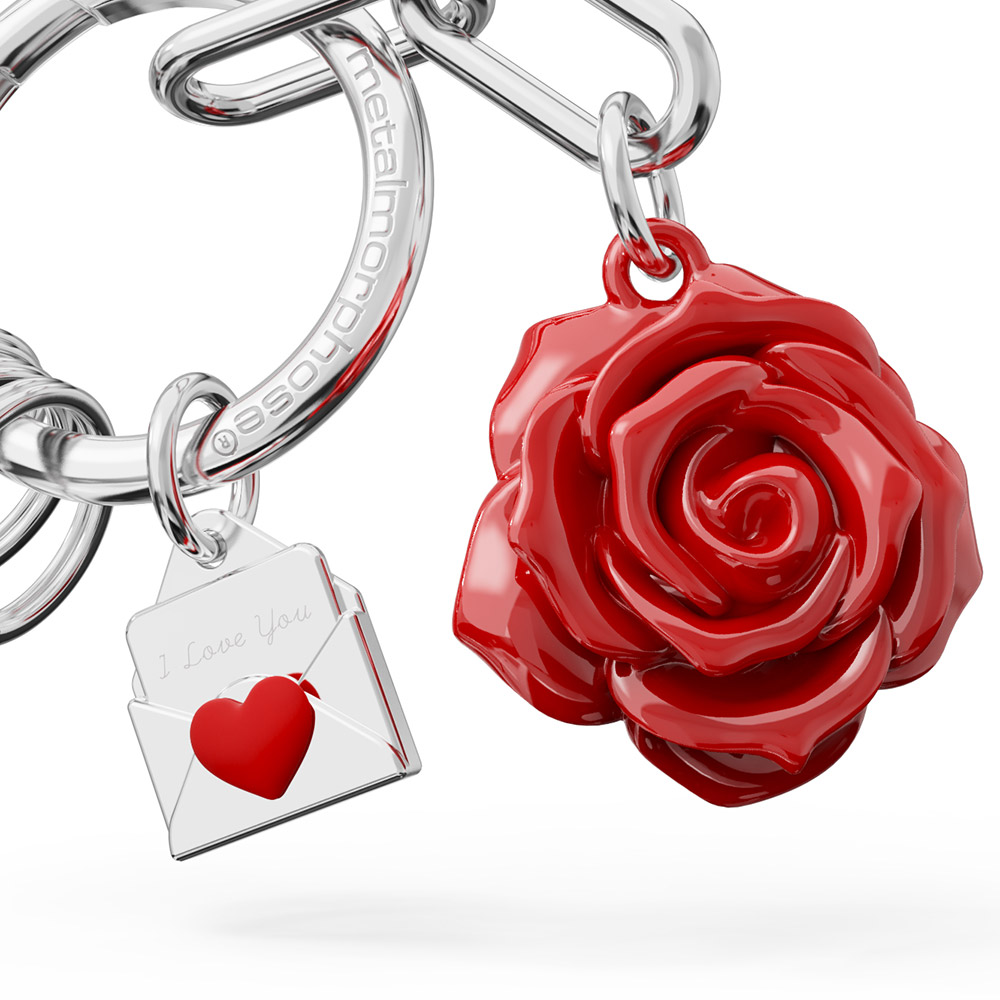 shiny chrome & red silicone heart, lasered letters, red paint flower finish